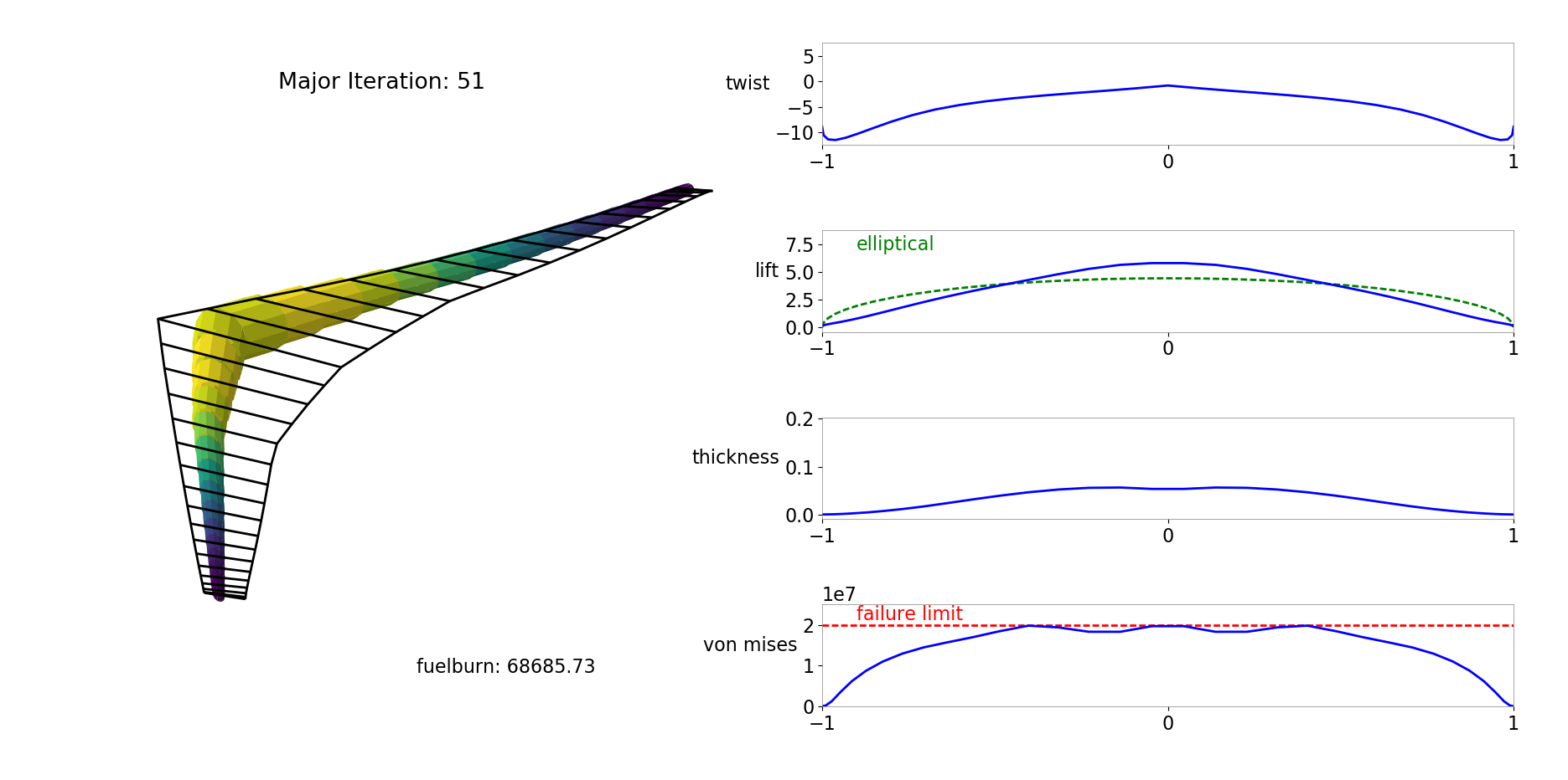 Aerostructural optimization consists of finding the wing planform, shape and structural sizing variables that optimize the performance of the aircraft. The following is a simple aerostructural optimization from the open source tool OpenAeroStruct.