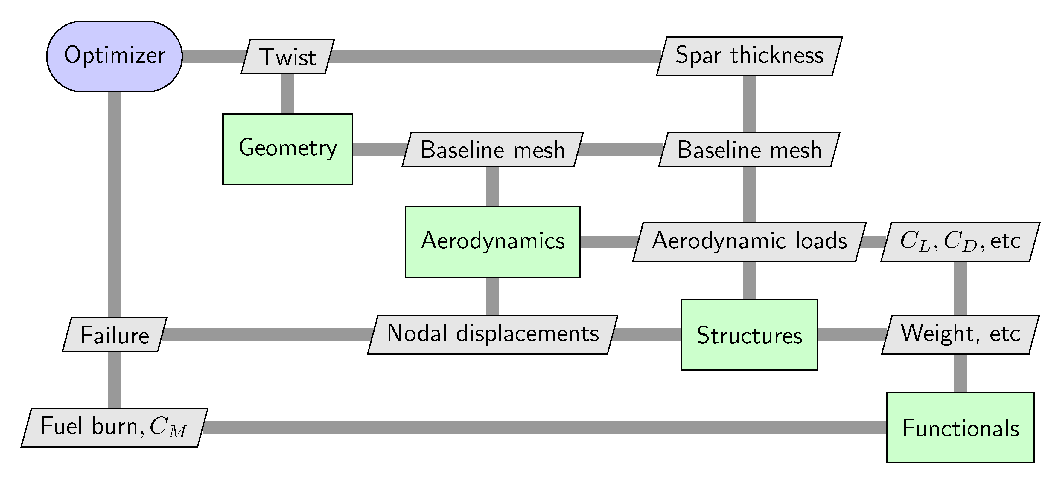 A key consideration in multidisciplinary design problems is connecting the different disciplines together for analysis and design. The extended design structure matrix (XDSM) diagram is a convenient way to visualize how the different analysis components interact together. The following XDSM diagram is from the above aerostructural optimization problem.