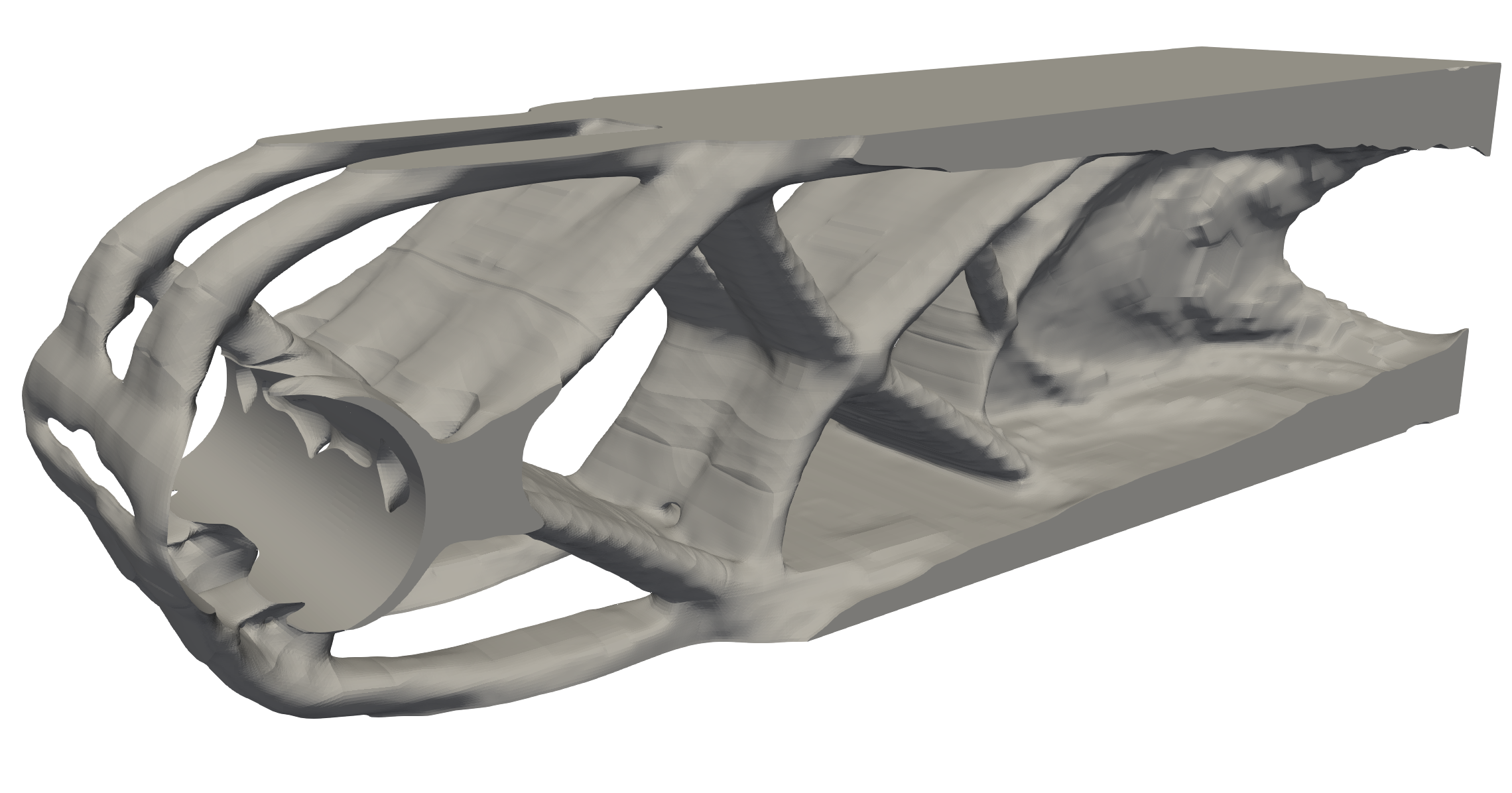 This image illustrates the results of a topology optimization case where the the objective is to minimize the mass of the structure subject to a constraint on the approximate maximum stress. Topology optimization problems may involve millions of design variables and require the solution of a challenging finite-element simulation. This course does not cover topology optimziation specifically, however this type of application can be tackled with the knowledge and theory developed in this course.
